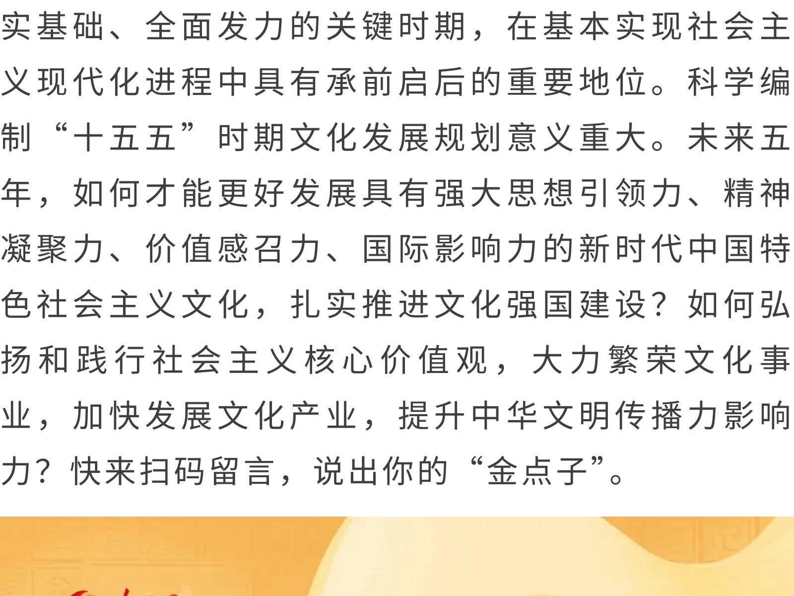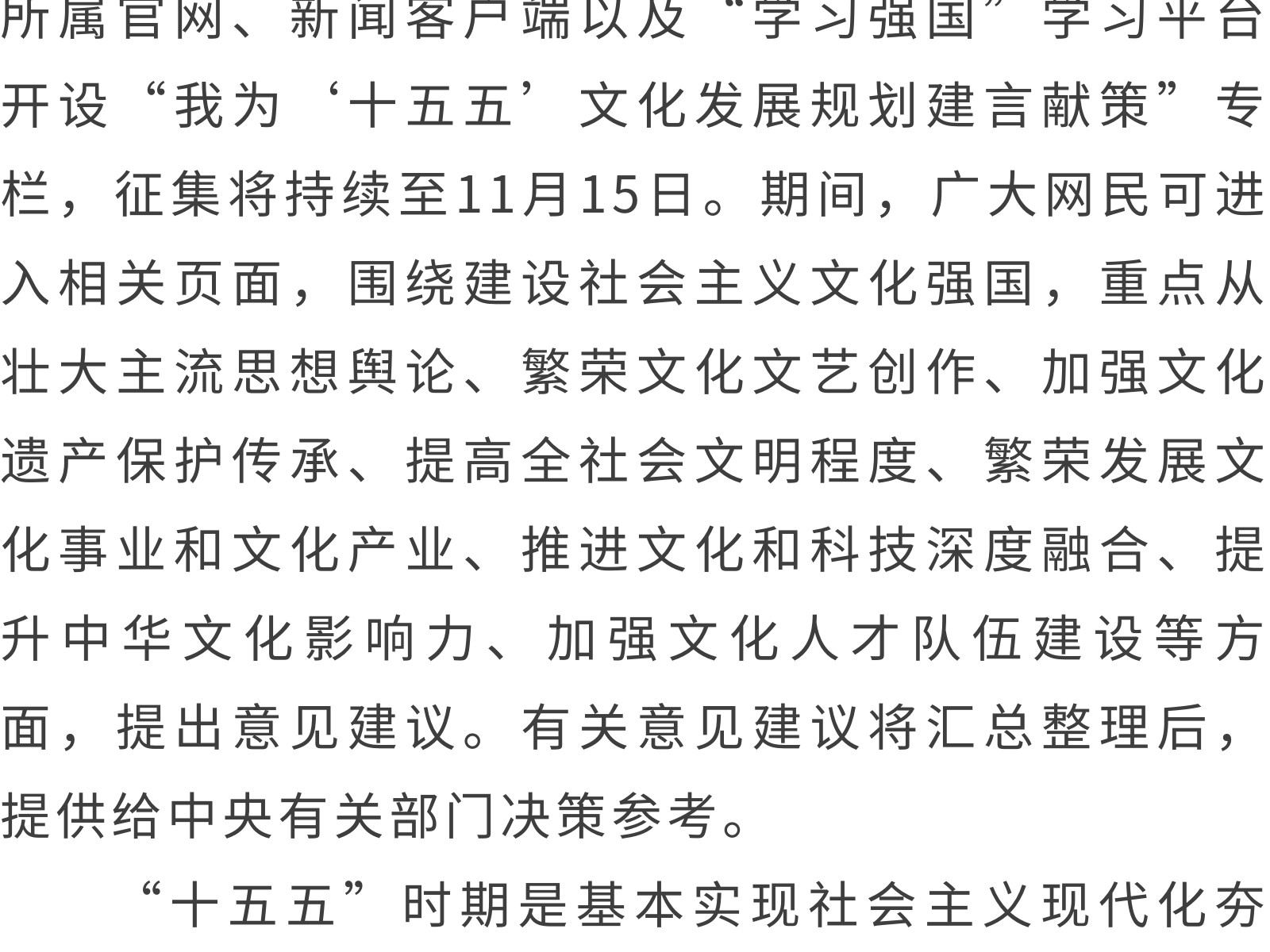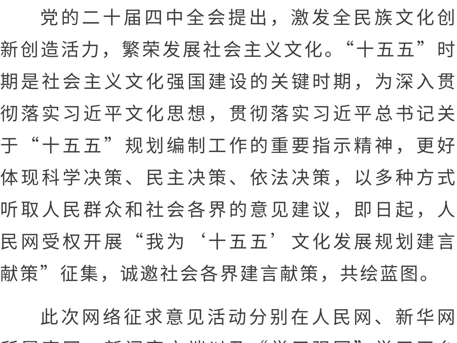 “十五五”文化發(fā)展規(guī)劃編制工作開展網(wǎng)絡(luò)征求意見活動 發(fā)布時間:2025年11月11日 11時來源:本站原創(chuàng)瀏覽:127 人次