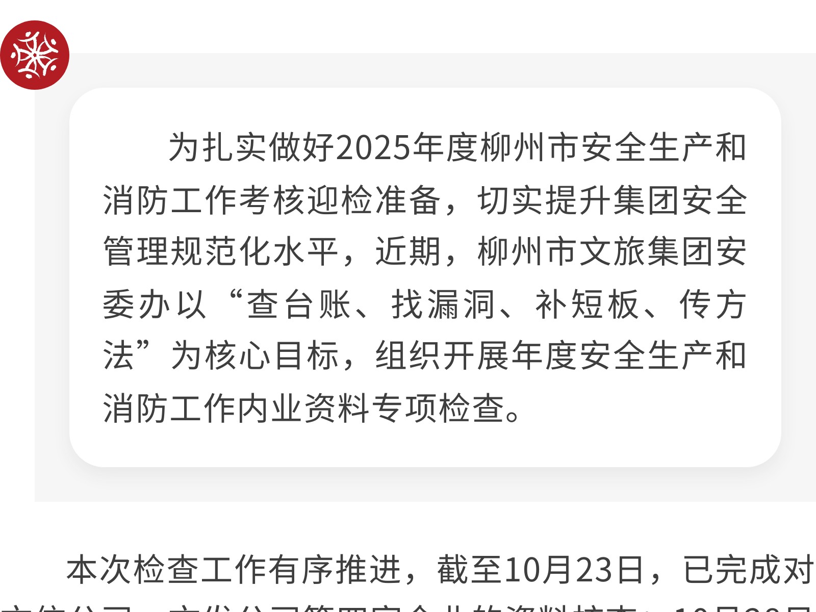 專項(xiàng)檢查安全內(nèi)業(yè)資料 以查促改筑牢安全防線 發(fā)布時(shí)間:2025年12月01日 10時(shí)來(lái)源:本站原創(chuàng)瀏覽:43 人次