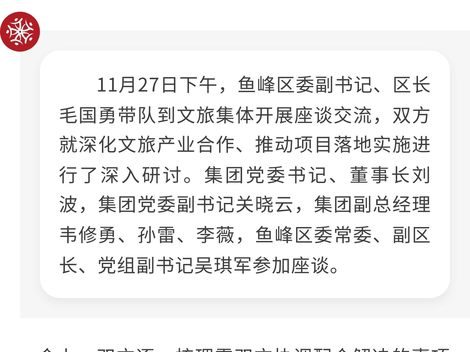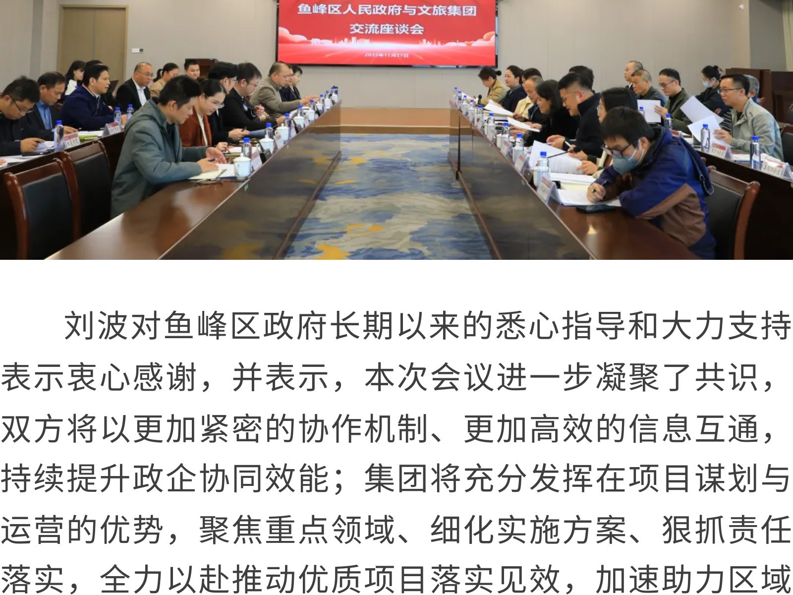 【同心協(xié)力 同頻共振】市文旅集團與魚峰區(qū)人民政府交流座談 發(fā)布時間:2025年12月03日 10時來源:本站原創(chuàng)瀏覽:29 人次