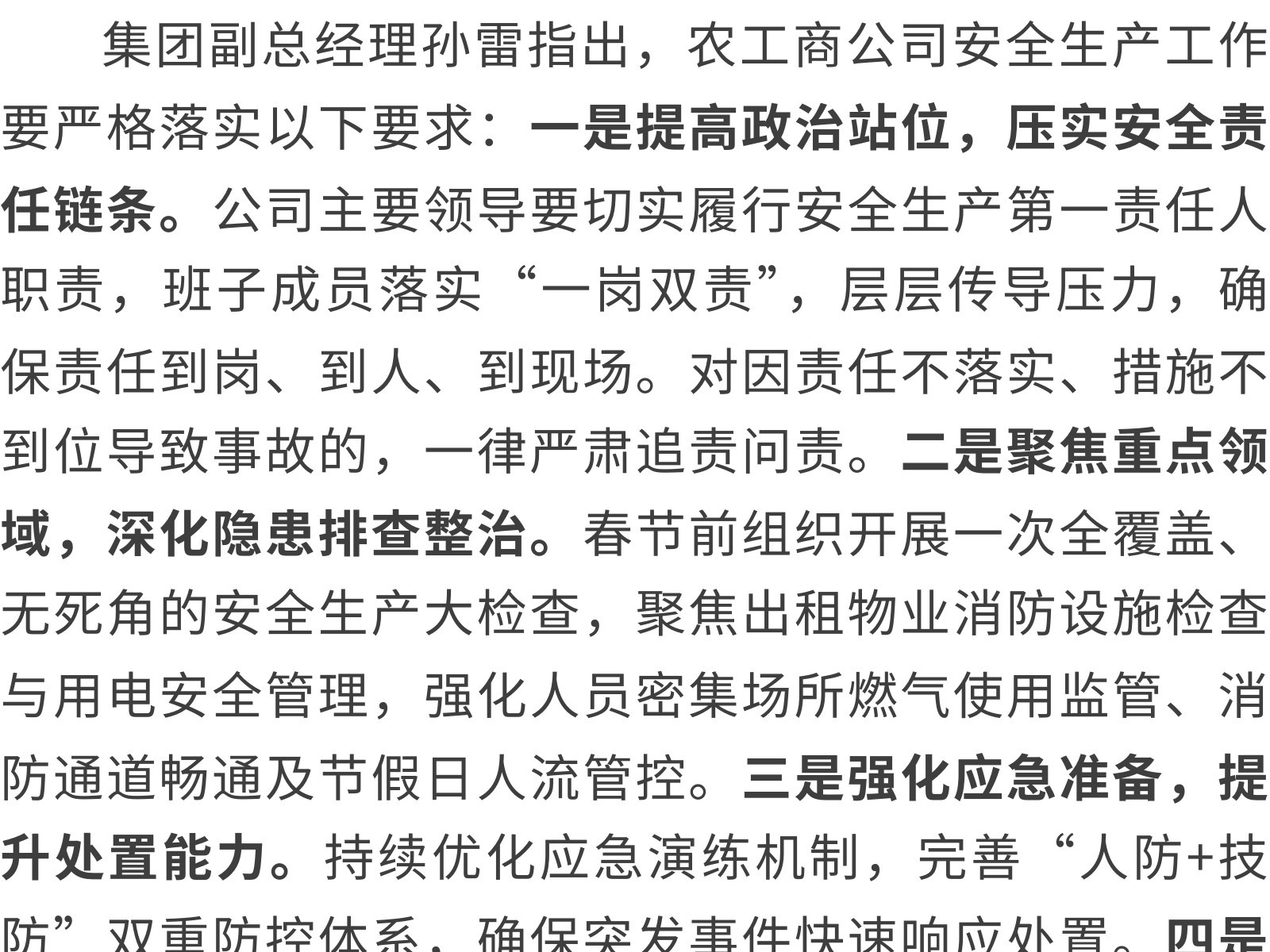 壓緊責(zé)任鏈條,筑牢歲末年初安全防線——柳州農(nóng)工商公司召開2025年度安全生產(chǎn)總結(jié)會 發(fā)布時間:2026年02月06日 12時來源:本站原創(chuàng)瀏覽:52 人次