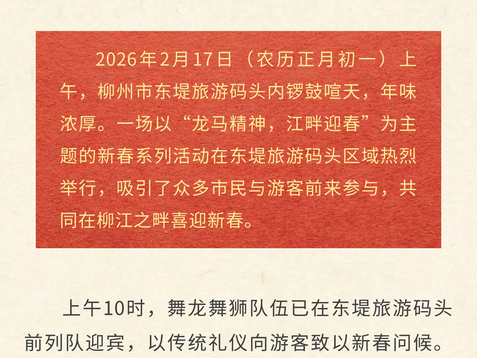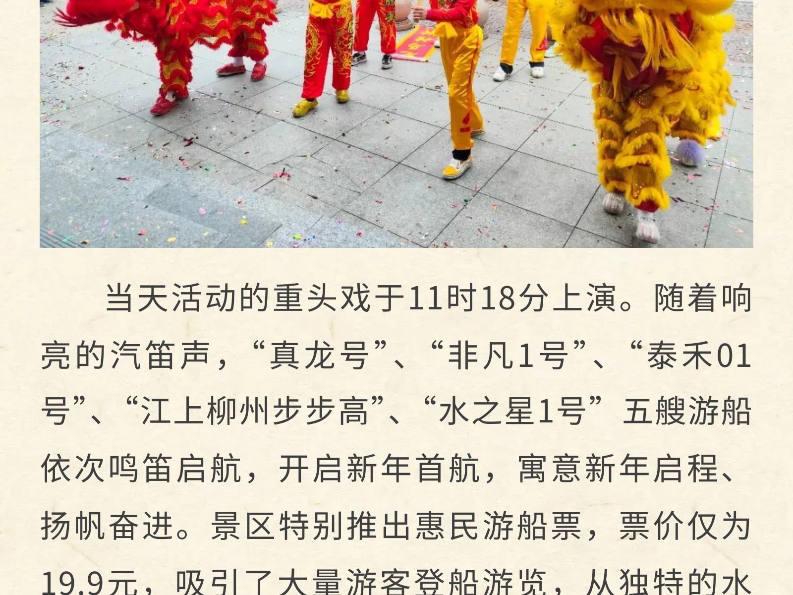 百里柳江景區(qū)“龍馬精神”迎新春,正月初一五船齊發(fā)迎客來(lái) 發(fā)布時(shí)間:2026年02月17日 13時(shí)來(lái)源:本站原創(chuàng)瀏覽:46 人次