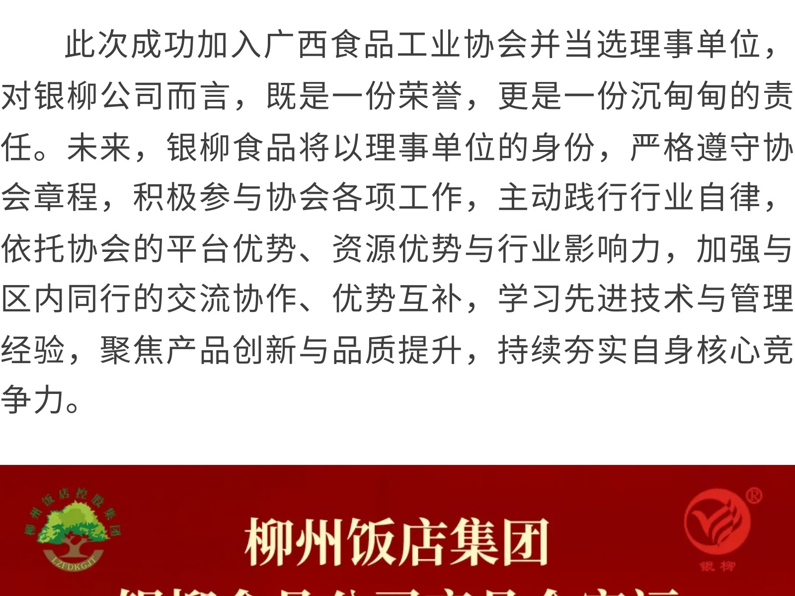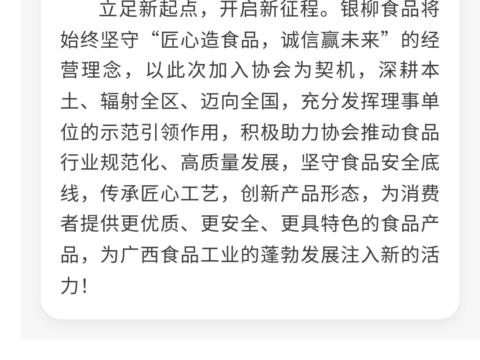 凝心聚力啟新程、勇?lián)姑蛭磥?lái)——柳州市銀柳食品有限公司當(dāng)選廣西食品工業(yè)協(xié)會(huì)理事單位 發(fā)布時(shí)間:2026年02月25日 15時(shí)來(lái)源:本站原創(chuàng)瀏覽:50 人次