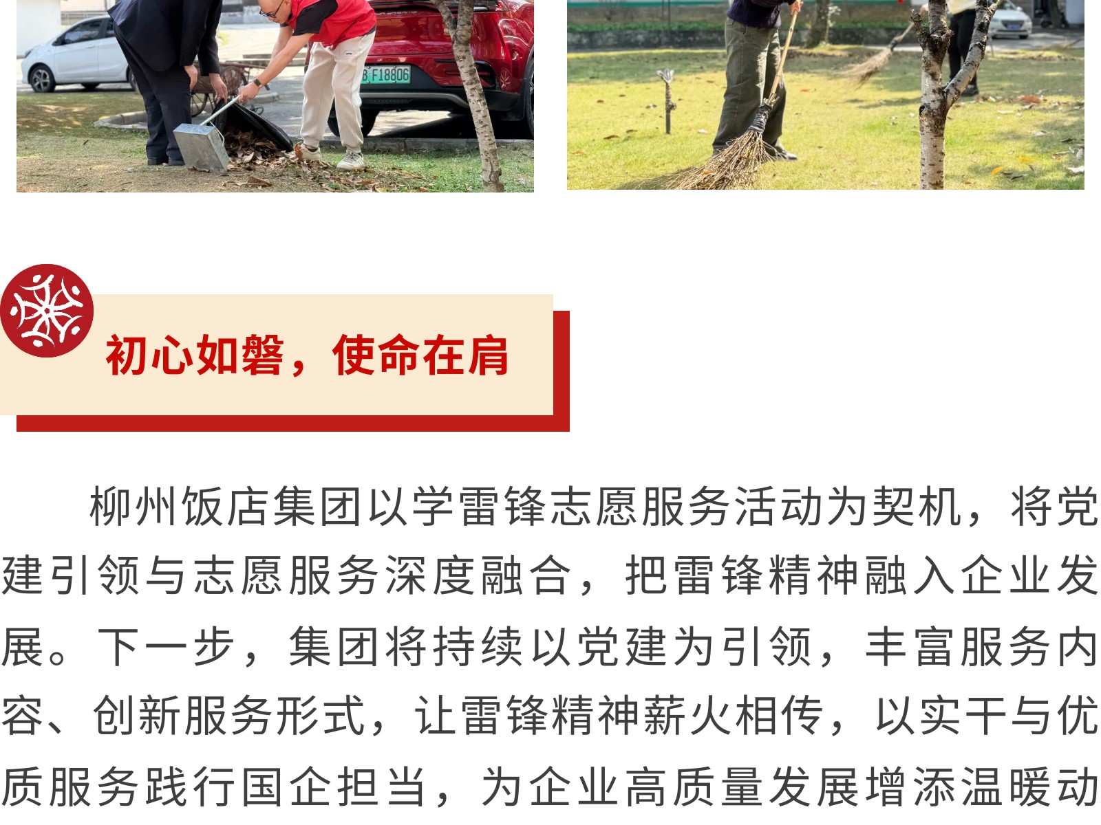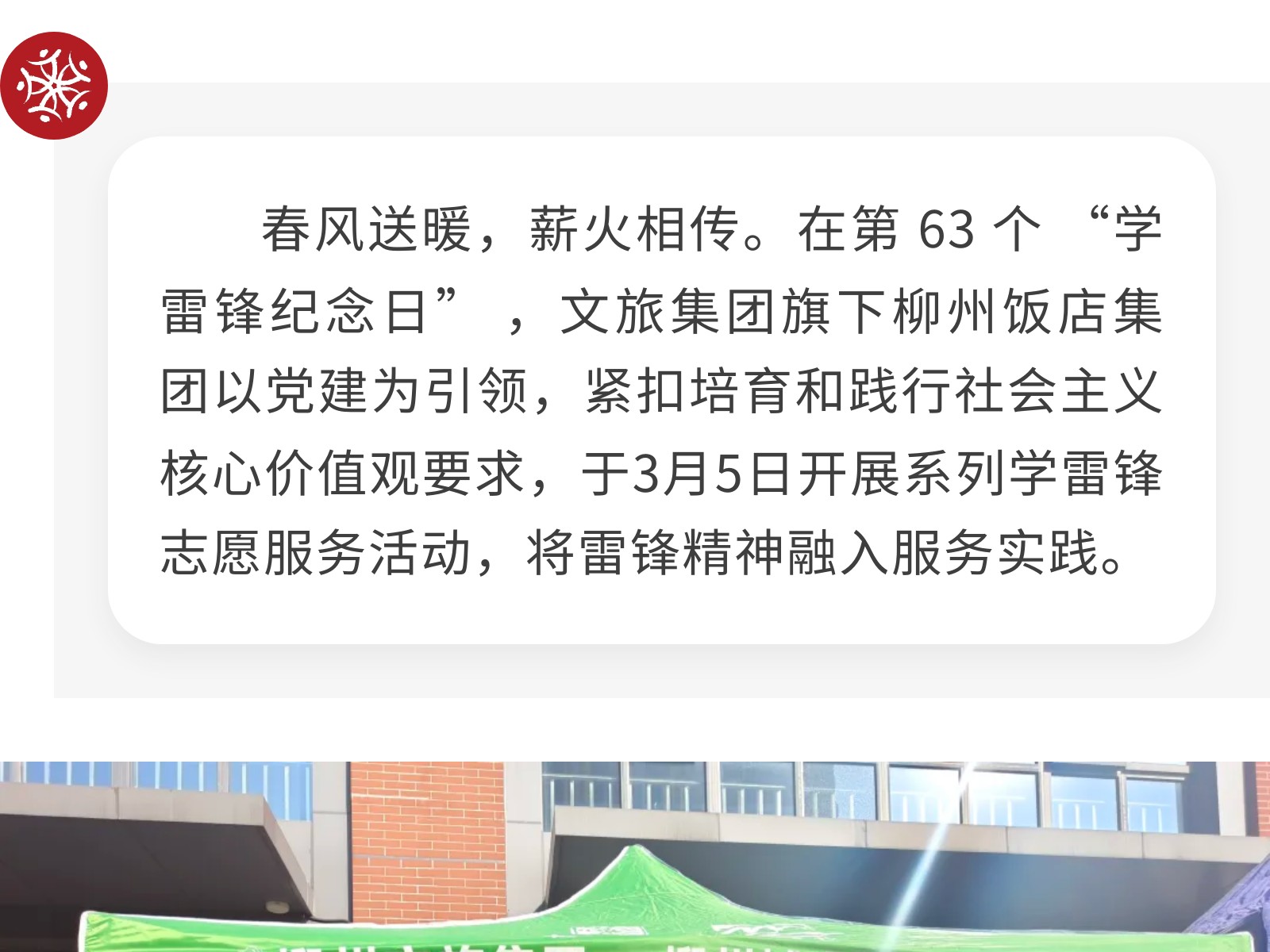 黨建引領(lǐng)聚初心 雷鋒精神綻芳華——柳州飯店集團(tuán)開(kāi)展學(xué)雷鋒志愿服務(wù)活動(dòng) 發(fā)布時(shí)間:2026年03月10日 09時(shí)來(lái)源:本站原創(chuàng)瀏覽:49 人次