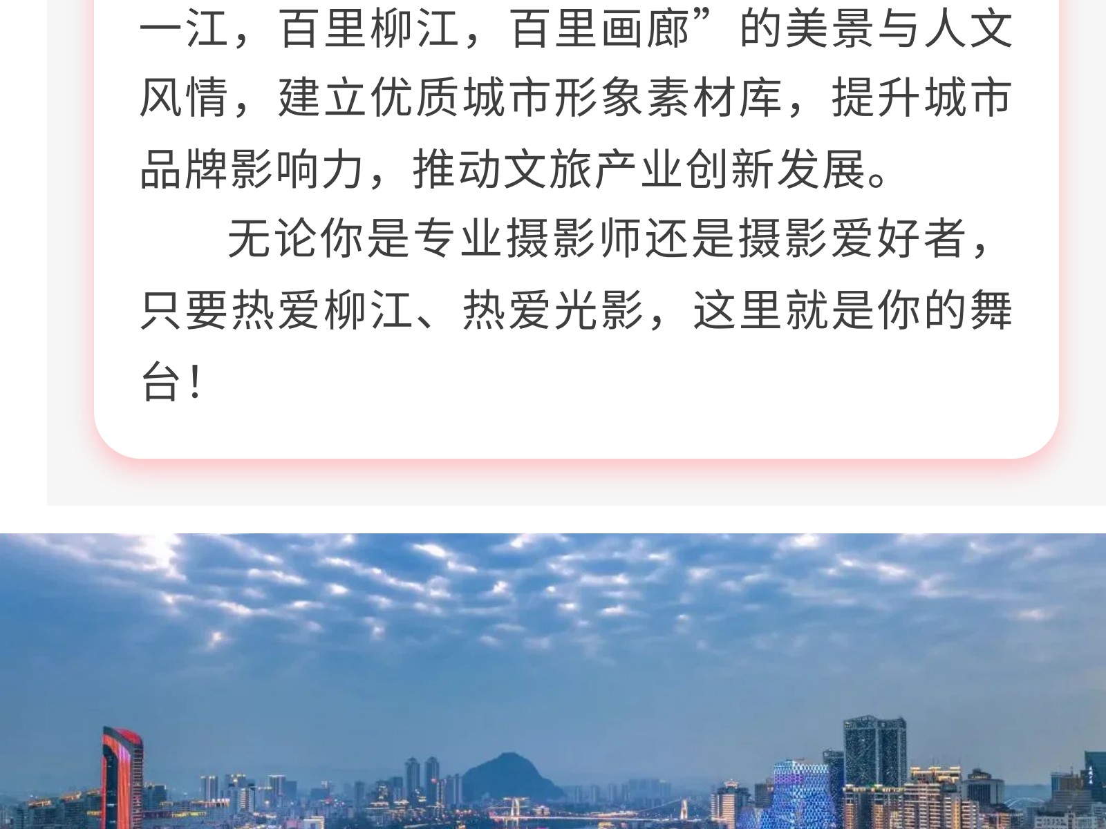 定格最美柳江!首屆“百里柳江”攝影大賽火熱征集中,邀你共賞百里畫廊! 發(fā)布時間:2025年04月26日 16時來源:本站原創(chuàng)瀏覽:98 人次