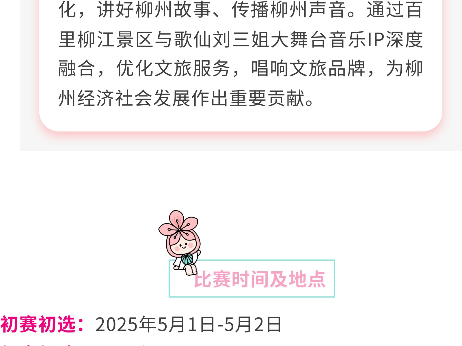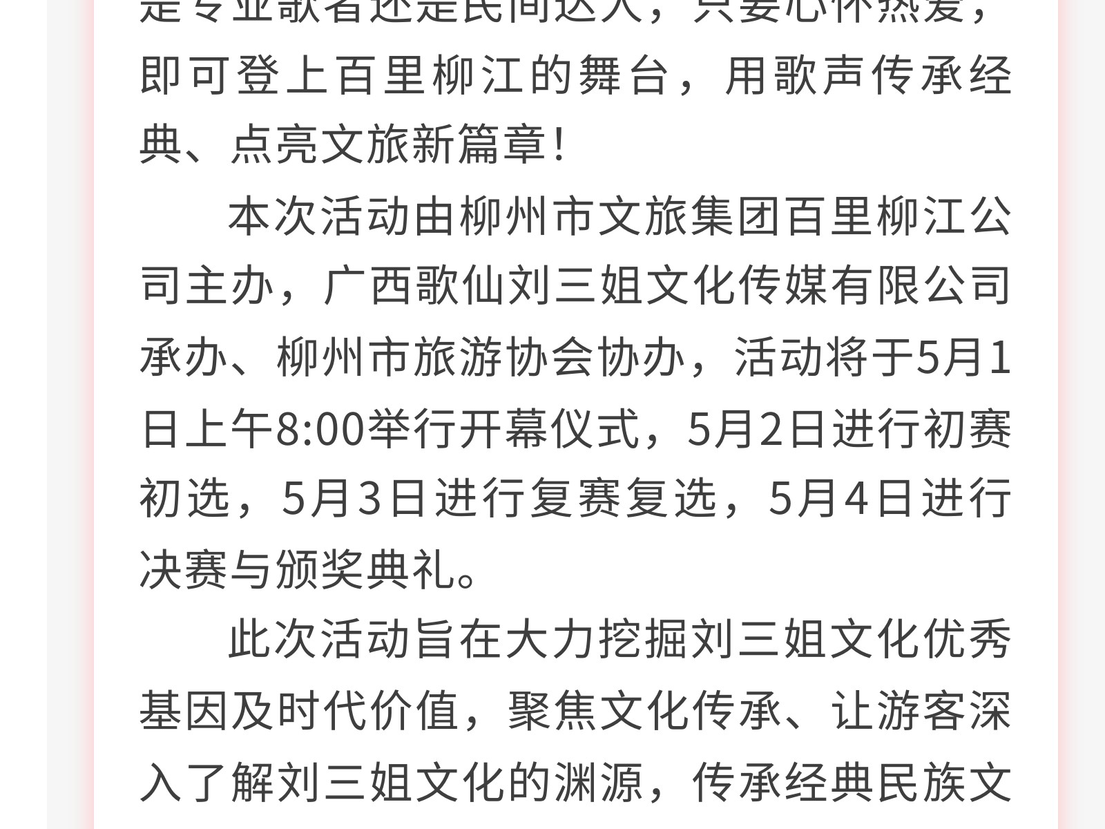 百里柳江歌仙劉三姐大舞臺(tái)等你來唱——柳州市首屆十大歌手大賽五一啟幕 發(fā)布時(shí)間:2025年04月27日 16時(shí)來源:本站原創(chuàng)瀏覽:96 人次